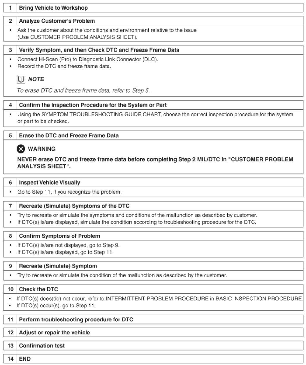 Sometimes the most difficult case in troubleshooting is when a problem symptom occurs but does not occur again during testing. An example would be if a problem appears only when the vehicle is cold but has not appeared when warm. In this case, the technician should thoroughly make out a "Customer Problem Analysis Sheet" and recreate (simulate) the environment and condition which occurred when the vehicle was having the issue.
