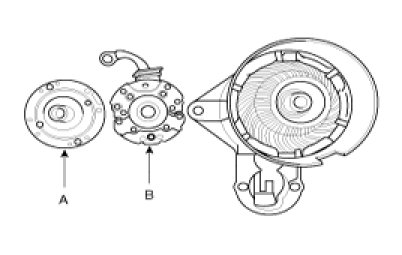 1. Make sure there is no continuity between the (+) brush holder (A) and (-) plate (B). If there is continuity, replace the brush holder assembly.