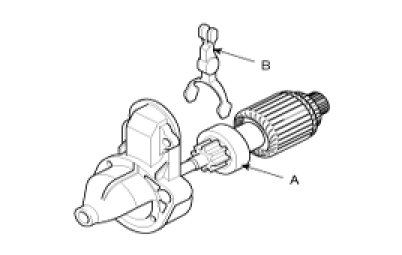 10. Remove the stopper (A), stop ring (B), overrunning clutch (C) and armature (D).