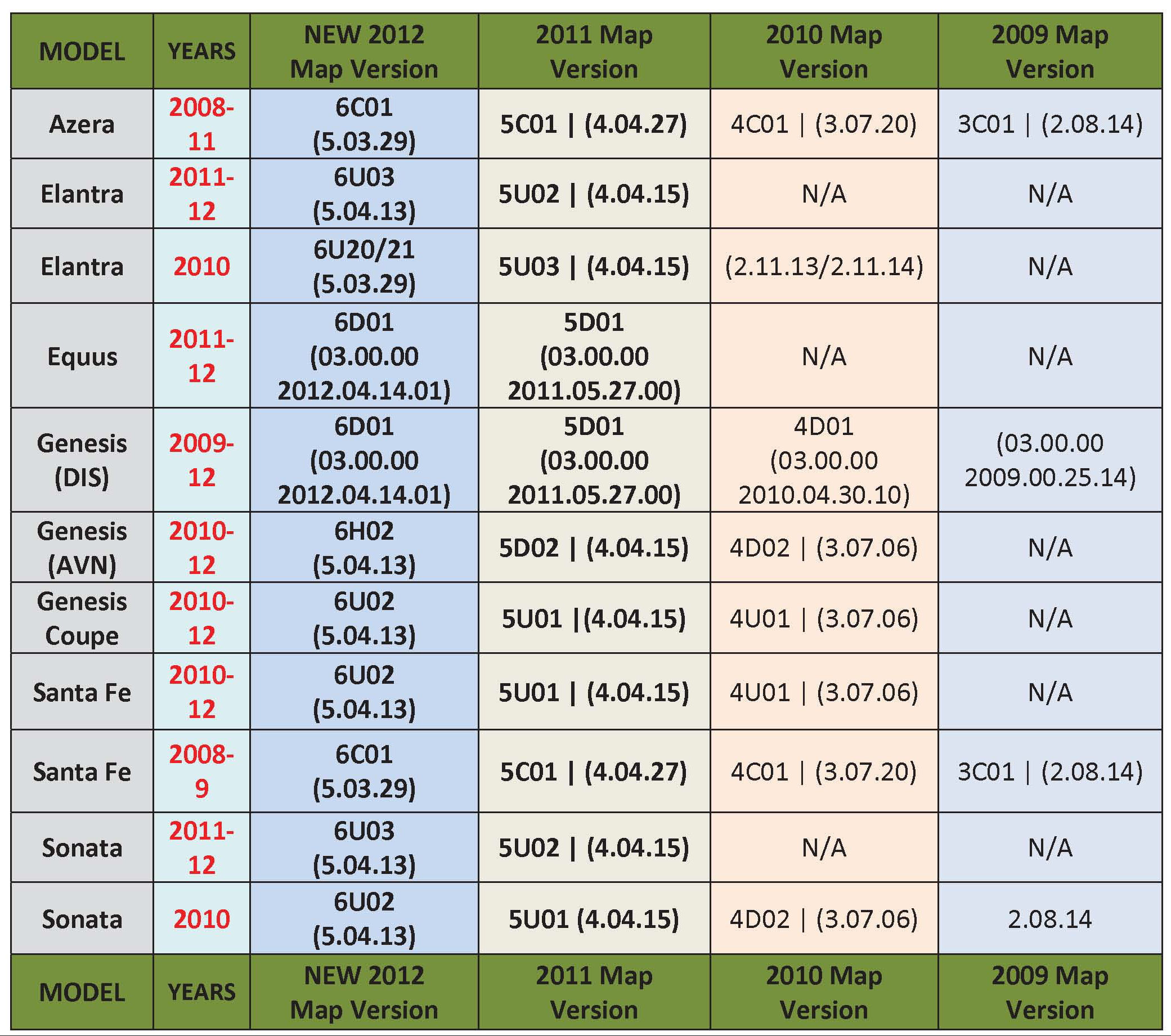^ Use the chart below to confirm the proper software before uploading into the vehicles navigation unit: