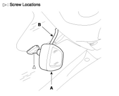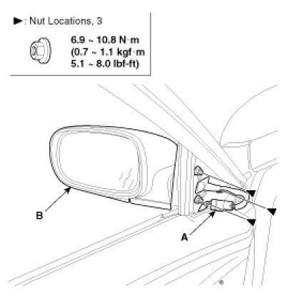 2. After disconnecting the connector (A), remove the outside rear view mirror (B).