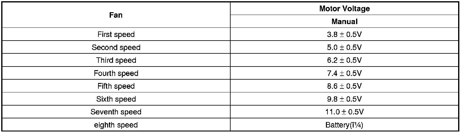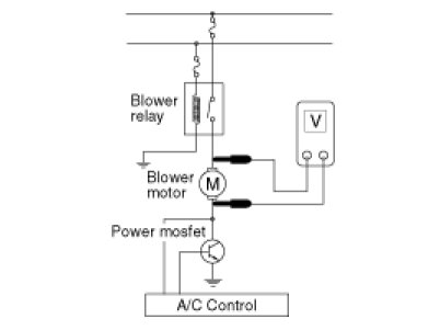 4. If measured resistance is specification, install power mosfet and ignition switch ON. Measure the voltage between blower motor terminals by operating control switch manually.