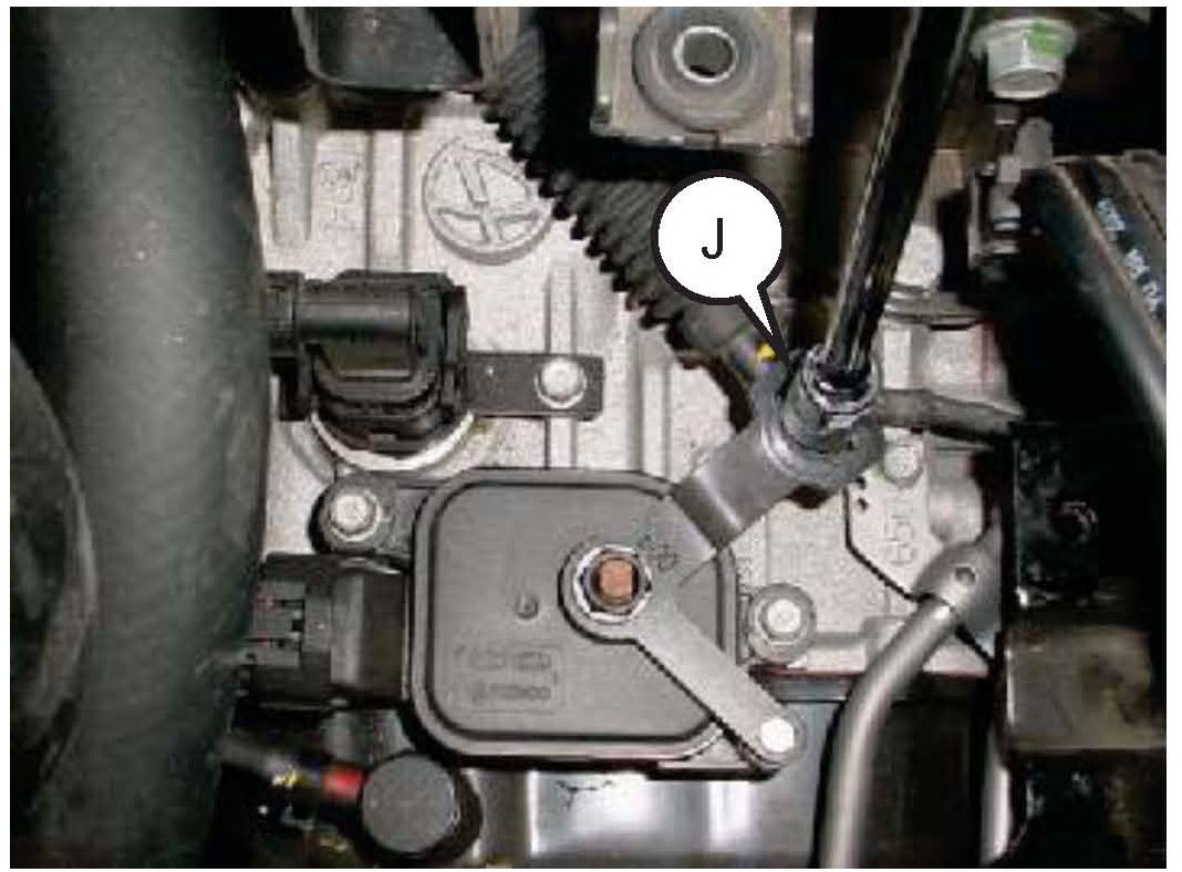 13. Install the shift cable mounting nut (J) and