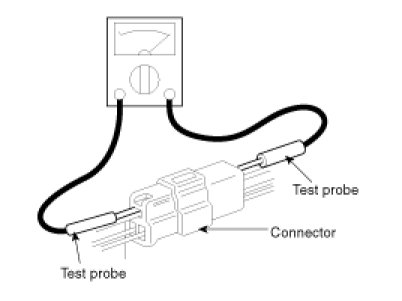11. When using a circuit tester to check continuity or voltage on connector terminals, insert the test probe into the harness side. If the connector is a sealed connector, insert the test probe through the hole in the rubber cap until it contacts the terminal, being careful not to damage the insulation of the wires.