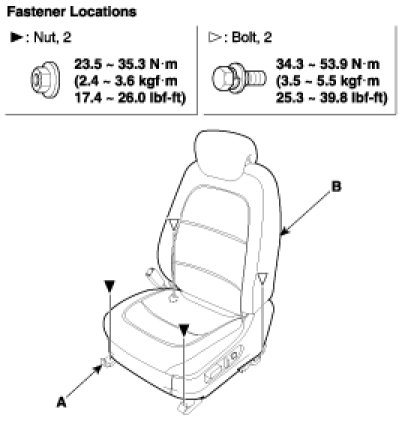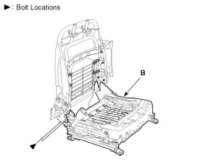 2. After loosening the seat assembly mounting bolts and nuts, remove the seat assembly (B).