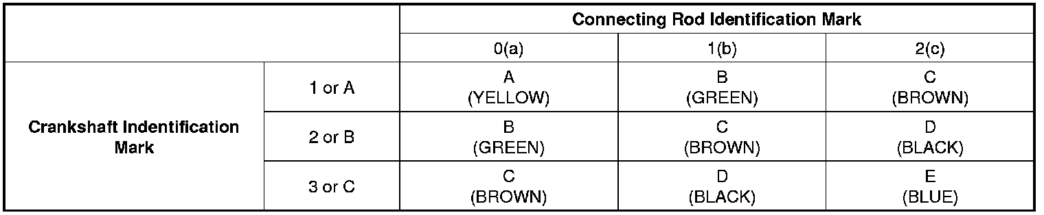 (6) If the plastigage measures too wide or too narrow, remove the upper half of the bearing, install a new, complete bearing with the same color mark (select the color as shown in the next column), and recheck the clearance.