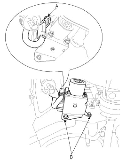 4. Remove the two HECU brake mounting bolts(B) , and then disassemble the HECU with the bracket.