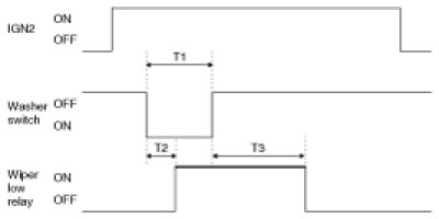1. Under IGN2 = ON, wiper LOW relay is turned ON after T2 from Washer switch ON if washer switch is ON for T1 and wiper LOW relay is turned OFF after T3.