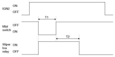 2. Under IGN2 switch ON, Wiper LOW relay is turned ON immediately from Mist switch ON if Mist switch ON for more than T1, Wiper LOW relay is turned OFF after T2 from Mist switch OFF.