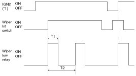 2. Under IGN2 switch ON, wiper LOW relay is turned ON after T2 from Washer switch ON if washer switch is ON for at least T1, and wiper LOW relay is turned OFF after T3 from the moment that Washer switch is turned OFF.