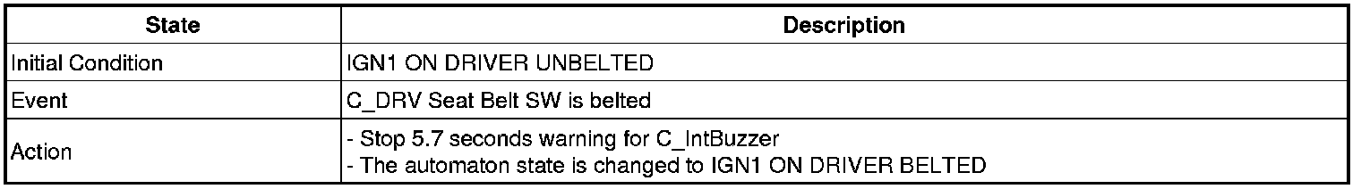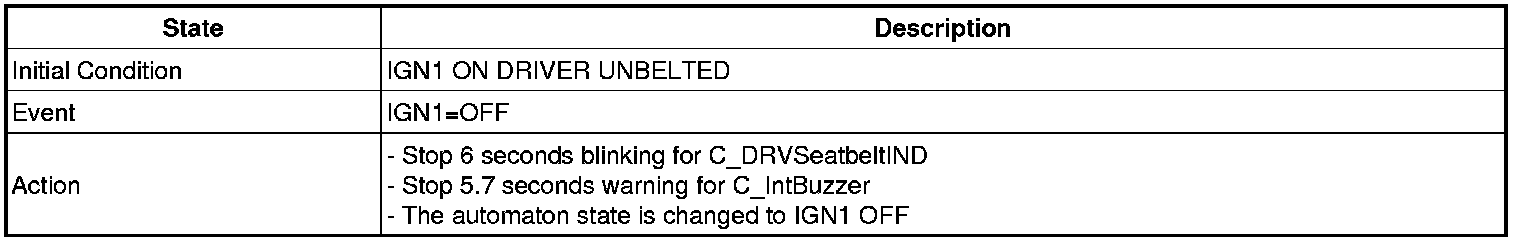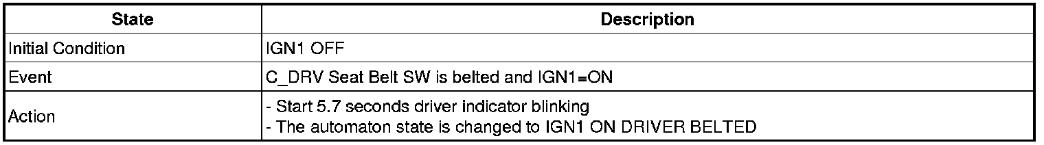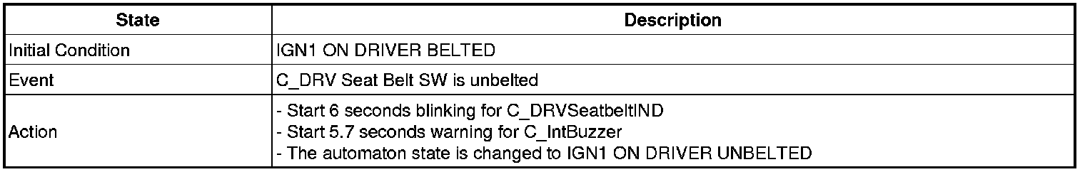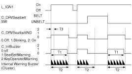 5. Seat belt fastened->unfastened when IGN1=ON state : if vehicle speed over 10Km/h,1time output. And if vehicle speed 5 - 10Km/h, Warning lamp for 1s(DUTY 50%) and Chime buzzer for 6 every 1s. If vehicle speed less than 5Km/h, Warning lamp for 6 every 1s(DUTY 50%)