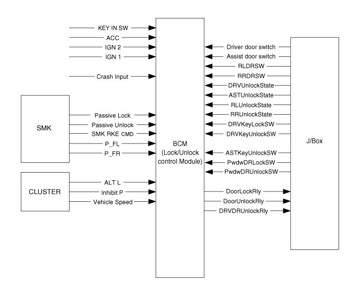 2. When the driver door switch (Assist door switch) = OPEN and driver unlock state (Assist unlock state) are lock state, passive KEY REMINDER signal received at the output ALL DOOR UNLOCK is for 1s.