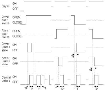 3. DRIVER DOOR UNLOCK output is ON during T3 when TXUlock signal is received. But, ALL DOOR UNLOCK output are ON during T3 if TUnlock signal is received within T1.
