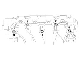 NOTE: When installing the intake manifold, tighten the bolts and nuts with pre-torque first, and then tighten the bolts and nuts with specified torque in the sequence shown.