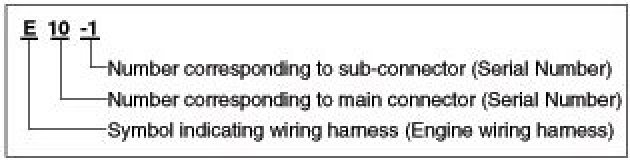 A Connector identification symbol consists of a wiring harness location classification symbol corresponding to a wiring harness location and number corresponding to the connector.
