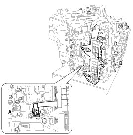 7. Remove the bolt (3ea) after disconnecting the solenoid valve connector (B) and the oil temperature sensor connector (A).
