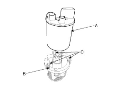7. Separate the fuel filter (A) from the fuel pump assembly (B) after disengaging the three fixing hooks (C).