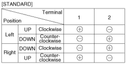 4. Connect the motor terminals directly to battery voltage (12V) and check that the motor operates smoothly. Next, reverse the polarity and check that the motor operates smoothly in the reverse direction. If the operation is abnormal, replace the motor.