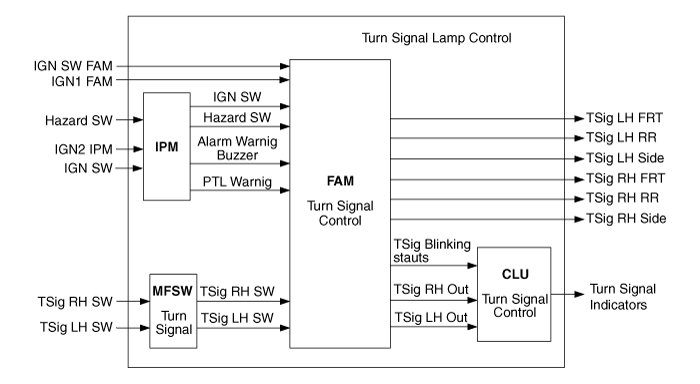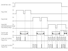 While IGN Switch FAM is IGN state, if Turn Signal RH Switch or Turn Signal LH Switch or Hazard switch is ON then turn signal outputs are turned ON following the switch input (LEFT, RIGHT or HAZARD).