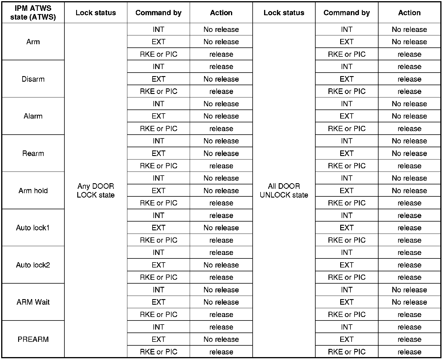 B. During Trunk is opened state, if the IPM receives the Trunk release command from door module via CAN, External Trunk Open SW then the IPM does not take trunk release action, but if the command comes from RKE or in case of PIC variant: from PIC as a passive trunk command then the release action is performed anyway.