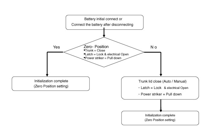 After Battery Power is on (Power-on stage) a initialization has to be done to find the closed trunk-lid position. After power-on the latch status is checked. If the latch is closed, it is assumed that the trunk lid is also closed. Therefore the trunk lid position is set to zero and initialization is finished. If the latch is opened it is assumed that the trunk lid is not closed. The power striker will be run into open position and the inner switch lamp will be switched on.