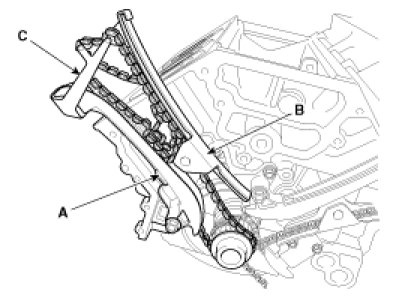 4. Install the timing chain with the timing chain tensioner arm (A) , the timing chain guide (B) and the timing chain locking tool (SST : 09231-2J600) (C).
