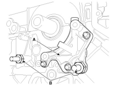 1. Install the tensioner adapter (A) and the timing chain guide bolts (B).