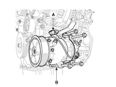 - Be careful not to damage the pulley (B) and compressor during removal/installation.