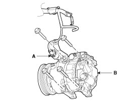 5. Remove the bolts, then disconnect the suction line (B) and discharge line (A) from the compressor. Plug or cap the lines immediately after disconnecting them to avoid moisture and dust contamination.