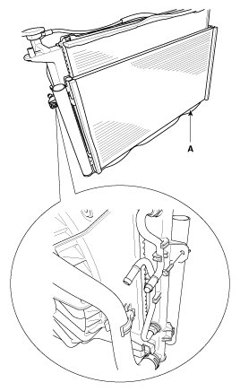 4. Remove 2 bolts, and then remove the condenser (A) by lifting it up. Be careful not to damage the radiator and condenser fins when removing the condenser.