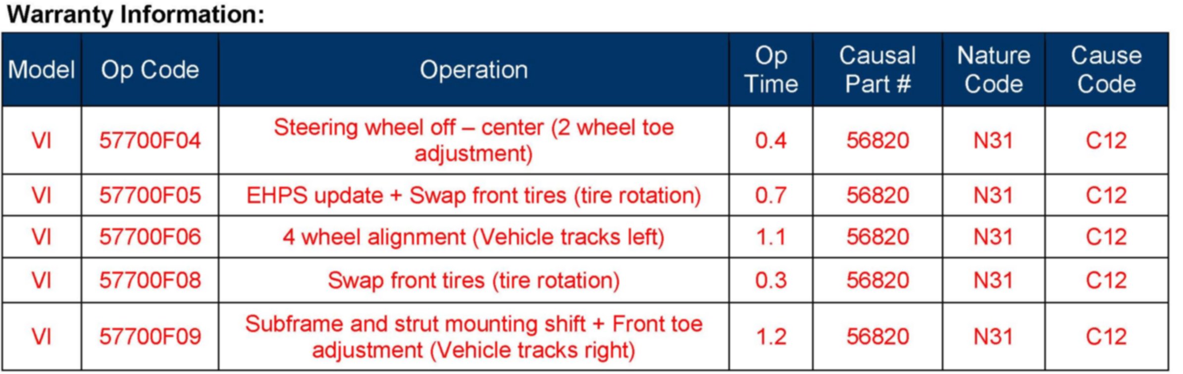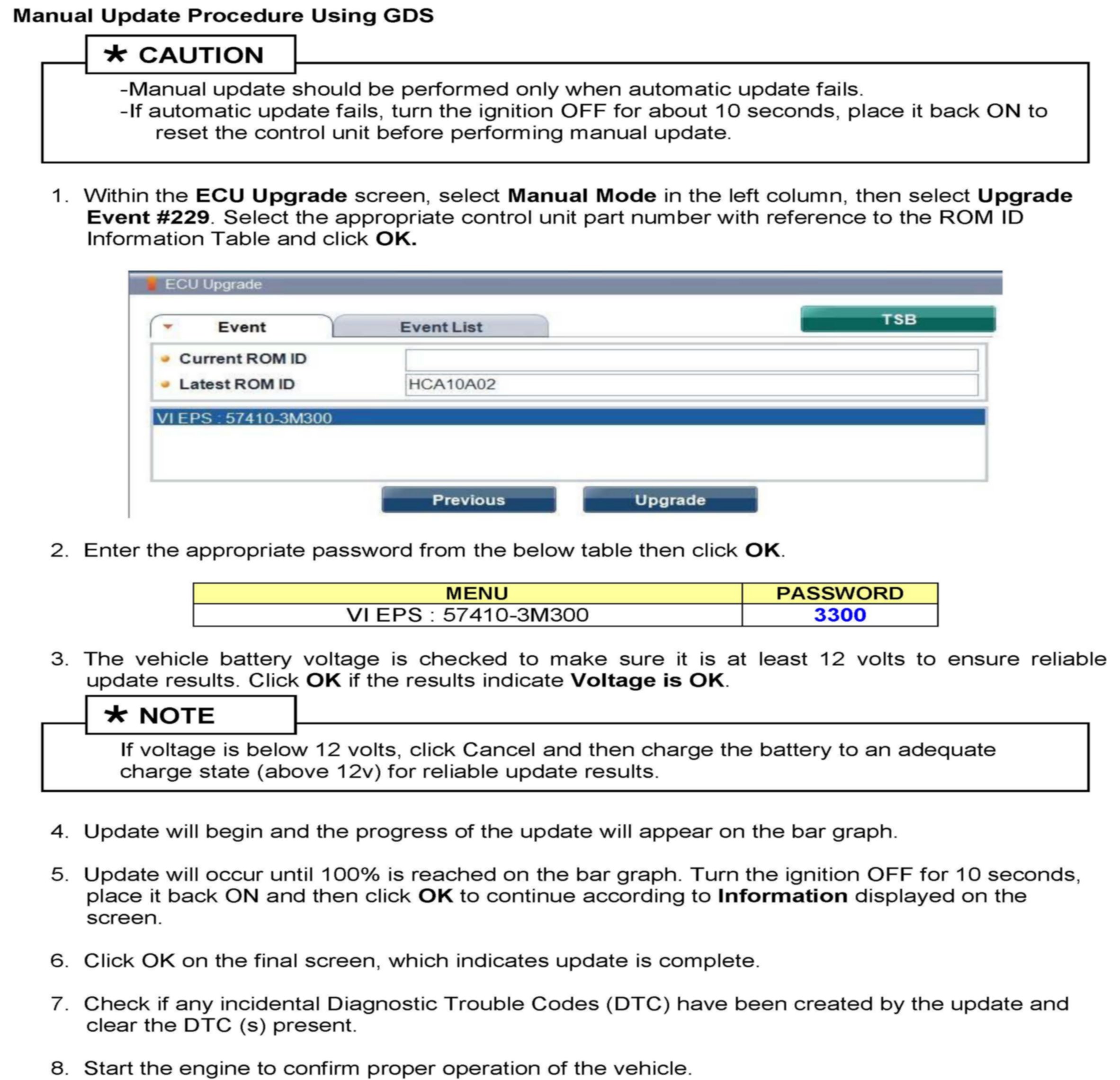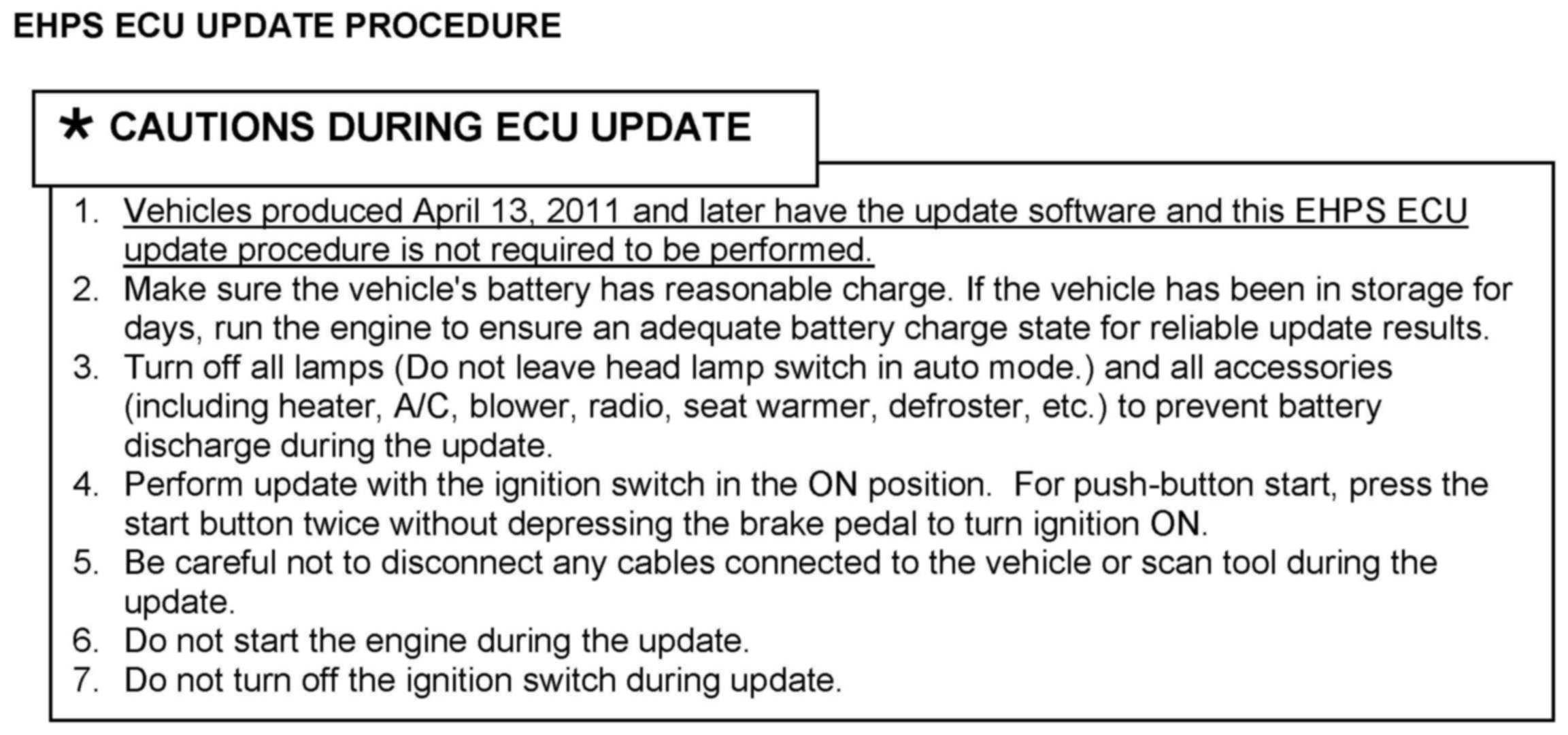 ^ Vehicles produced April 13, 2011 and later do not require the EHPS update procedure.