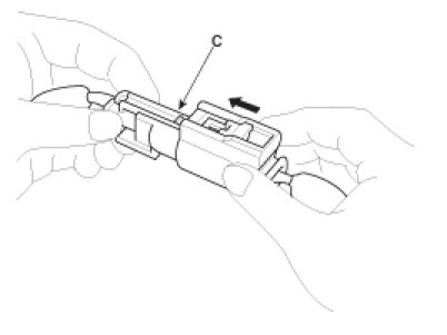 Hold both connector halves and press firmly until the projection (C) of the sleeve-side connector clicks to lock.