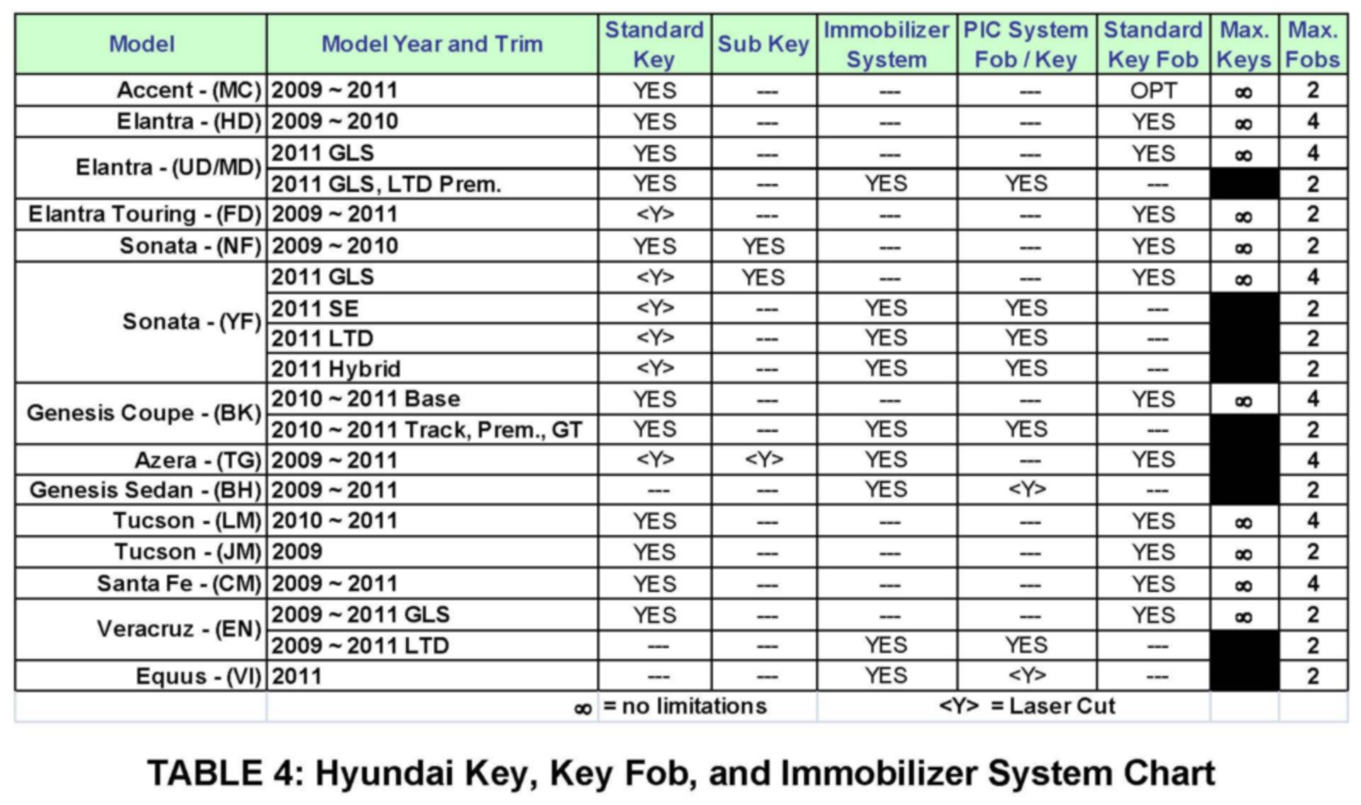 Table 4 - Hyundai Key, Key Fob, and Immobilizer System Chart