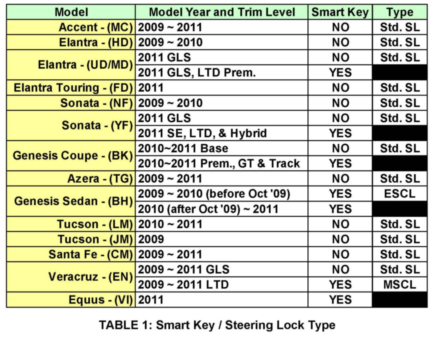 1. Smart Key and Electronic Steering Column Lock (ESCL) application table above. Vehicles equipped with a Smart Key immobilizer are not equipped with the steering lock feature. **See note below.