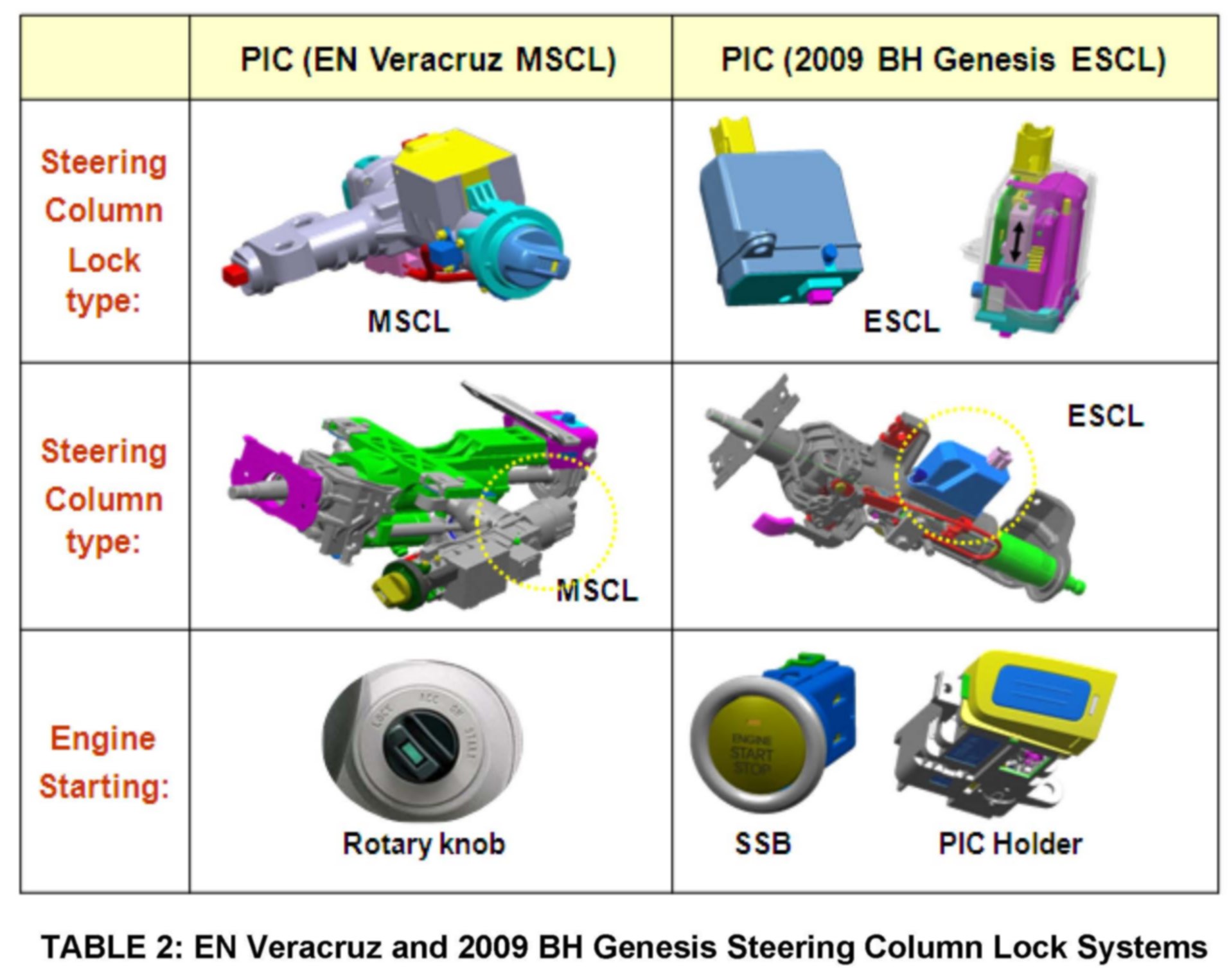 Veracruz LTD models may be equipped with MSCL (Mechanical Steering Column Lock) as noted above. The 2009 BH Genesis models use ESCL (Electronic Steering Column Lock) feature to lock the steering wheel.