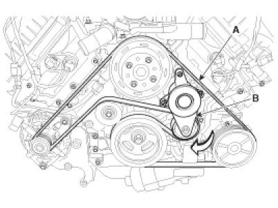 4. Using the wrench turn the tensioner counterclockwise and loosen. Then remove the drive belt (A).