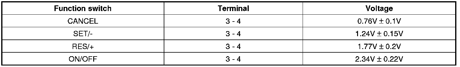 2. Measure voltage between terminals on the harness side connector when each function switch is ON (switch is depressed).