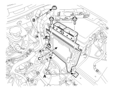 5. Remove the TCM (C) after removing the mounting bolts (A) and nut (B).