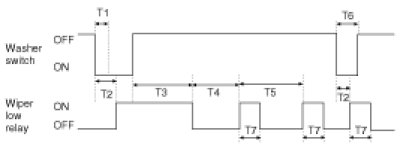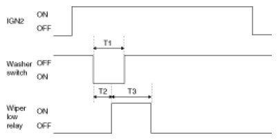 1. Under IGN2 = ON, wiper LOW relay is turned ON after T2 from Washer switch ON if washer switch is ON for T1 and wiper LOW relay is turned OFF after T3.