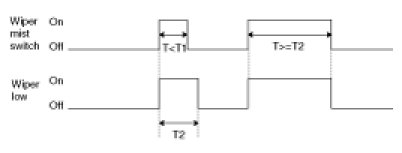 2. Under IGN2 switch ON, Wiper LOW relay is turned ON immediately from Mist switch ON if Mist switch ON for more than T1, Wiper LOW relay is turned OFF after T2 from Mist switch OFF.