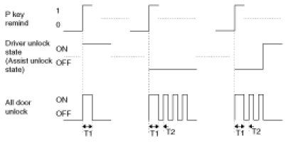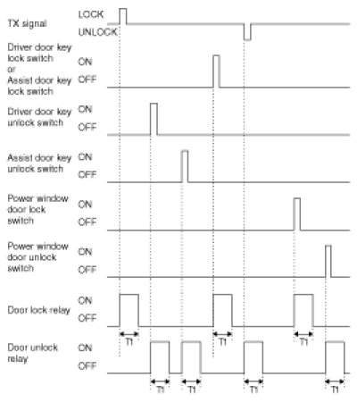 3. Turn Driver Unlock Relay output ON during T2 when receiving TUNLOCK signal. However, turn Driver Unlock Relay, Unlock Relay (Central Unlock) output during T2 if TUNLOCK is received within T1.