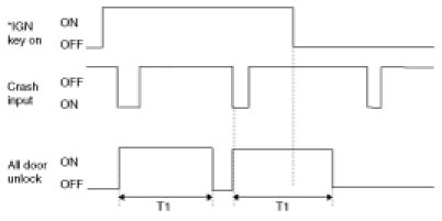 1. FOB IN ON or KEY IN ON or ACC ON or IGN1 ON or IGN2 ON state Crash Input ON signal is ON, T1 is performed for ALL DOOR UNLOCK output. (CRASH UNLOCK output)