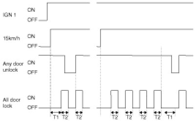 1. ALL DOOR LOCK signal is output if vehicle speed is 15km/h within T1 under IGN1 ON && Alt L ON. But ALL DOOR LOCK , All DOOR LOCK signal is not output if all DOOR is LOCK or ALL DOOR are FAIL.