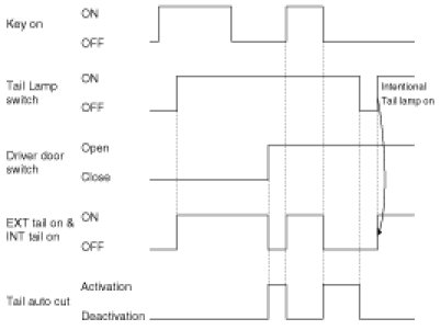 The "Tail Auto Cut" strategy ensures that Tail lamps are turned off even if a driver forgets to turn them off. When the Tail lamp is turned on by Tail lamp switch, after key insertion , and if a user removes key and opens the driver side door(or vice versa), the Tail lamps are automatically turned off. While "Tail Auto Cut" function is active, if a user turns off the Tail lamp switch or inserts key, "Tail Auto Cut" function will be deactivated and Tail lamps can be turned on.