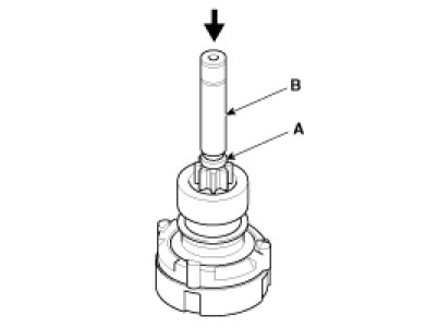 Using a suitable pulling tool (A), pull the overrunning clutch stopper (C) over the stop ring (B).