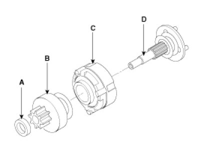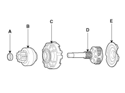 11. Disconnect the stopper (A), overrunning clutch (B), internal gear (C), planet shaft (or drive shaft) (D) and/or gasket sheet (E).