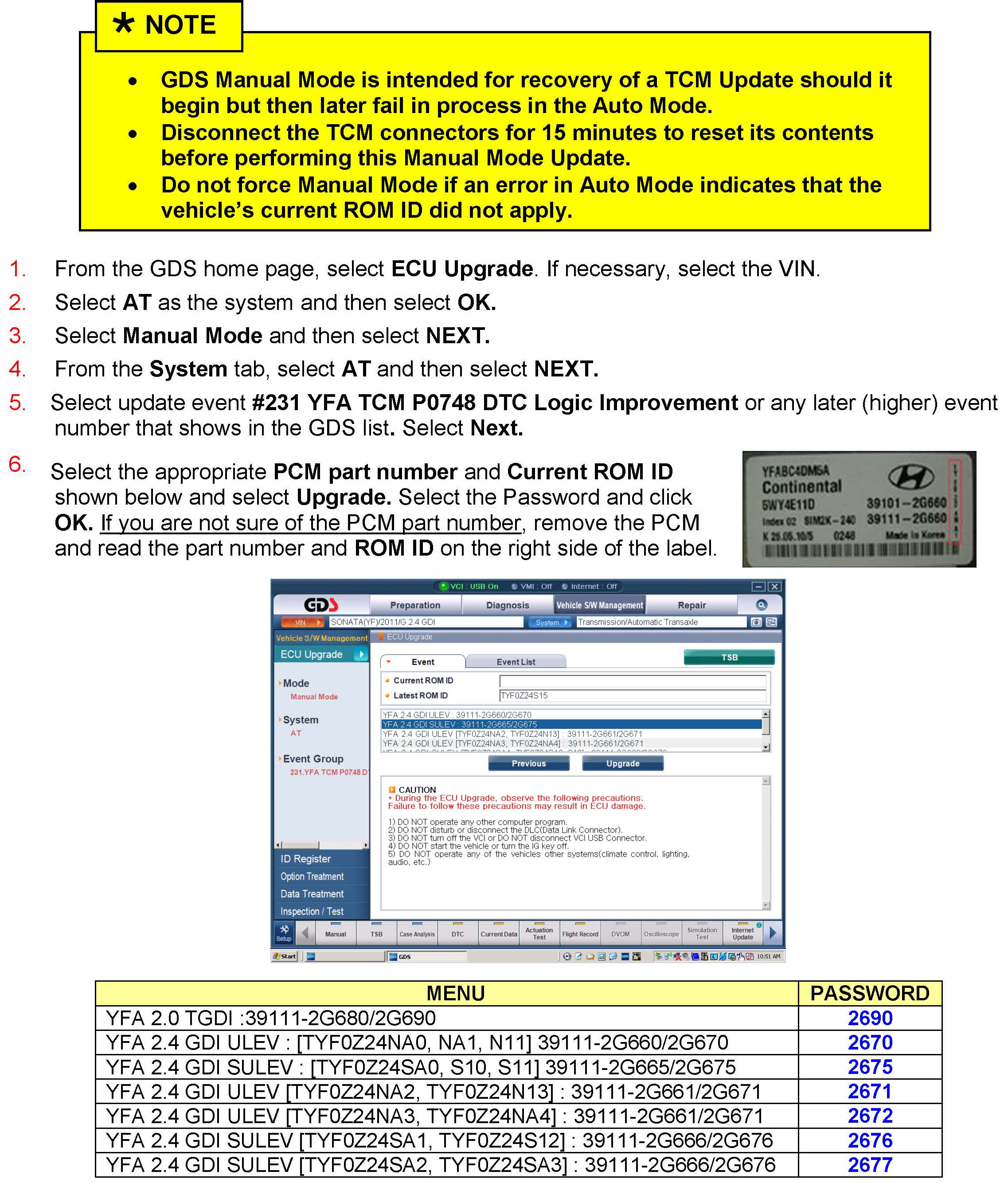 This bulletin provides a procedure to update the TCM for 2011 Sonata 2.0L and 2.4L (YFA) vehicles with revised logic for Diagnostic Trouble code P0748 (Pressure Control Solenoid Valve Circuit).