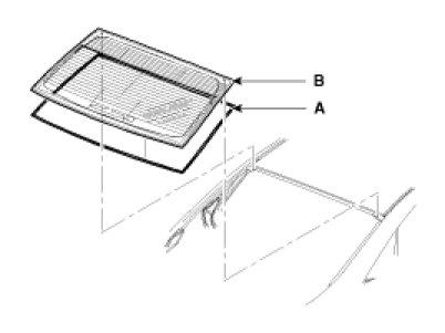 6. Pack adhesive into the cartridge without air pockets to ensure continuous delivery. Put the cartridge in a caulking gun, and run a bead of sealant (B) around the edge of the rear window glass (A) as shown. Apply the adhesive within 30 minutes after applying the glass primer. Make a slightly thicker bead at each corner.