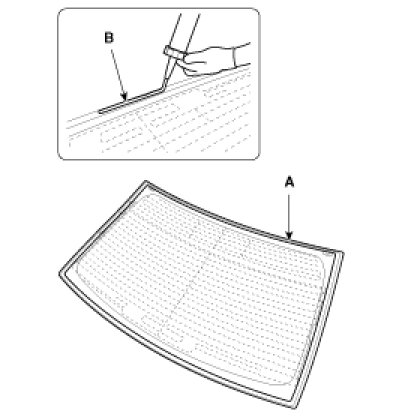 5. Paste the rear window glass molding (A), and then install the rear window glass (B).