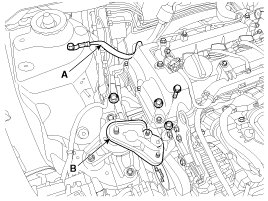 23. Disconnect the ground cable (A) and remove the engine mounting support bracket (B).